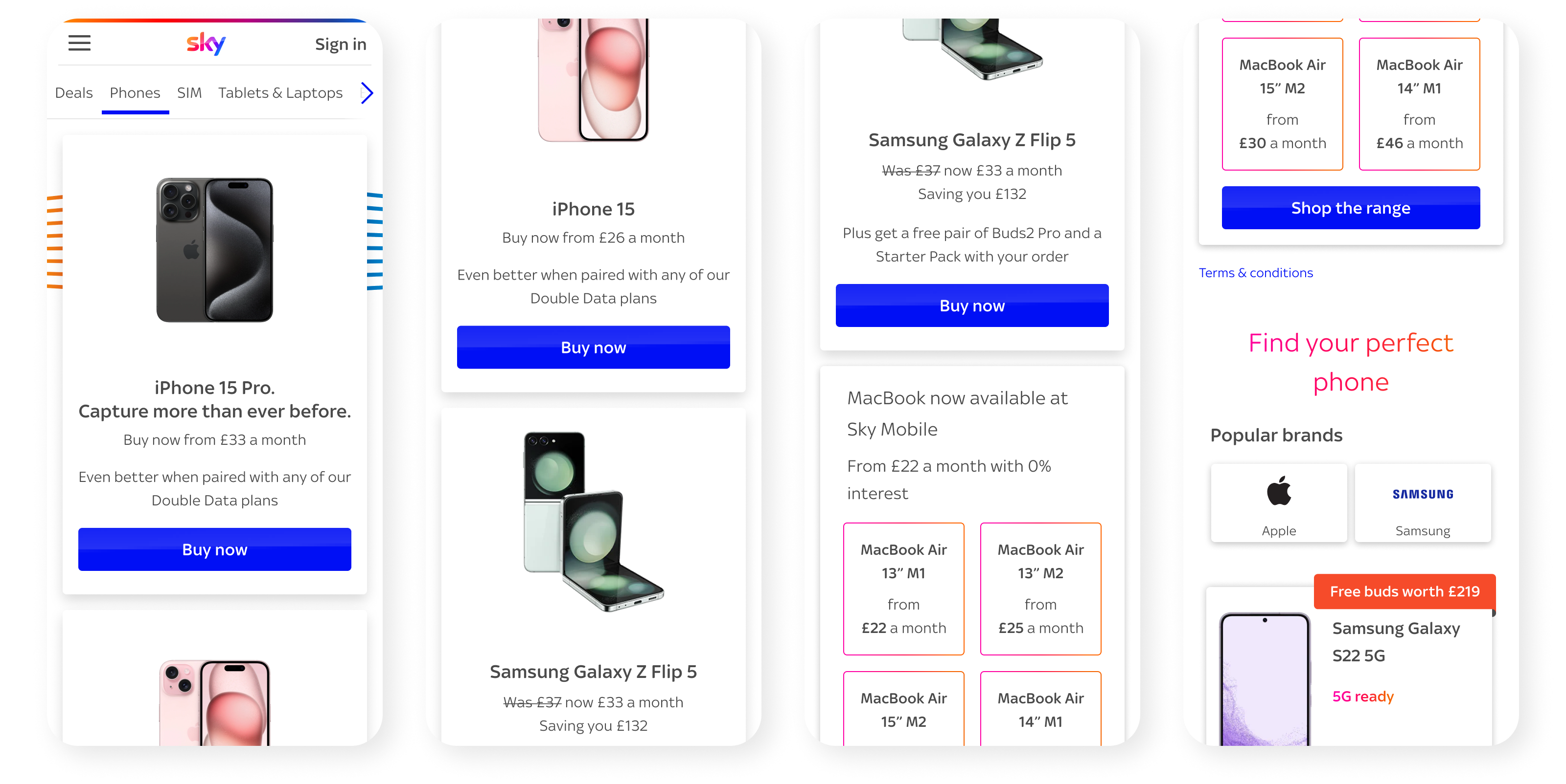 Image 1: The old Sky Mobile landing page was driven by commercial placements (big manufacturer promos at the top) which pushed the actual Sky Mobile offer into the background. That made users think Sky only sold the three featured phones leading to high drop-off and abandonment.