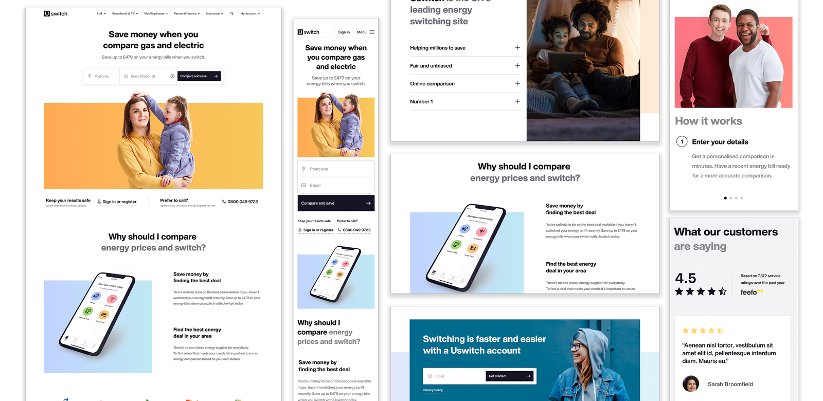 The re-skin phase (shown here) was tackled by replacing Uswitch’s style with all the new brand colours, fonts and Tone of Voice (TOV). We’ve adapted this on a like for like basis, transitioning from old to new, with a few minor tweaks.